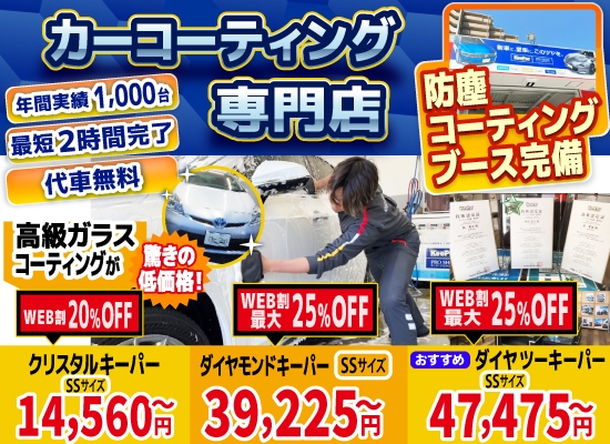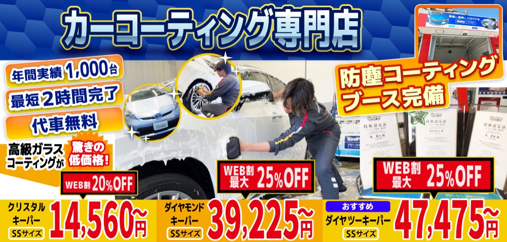| 担当者のコメント | 当店で初めての施工でした! ダイヤモンドキーパーは、1年に1度のメンテナンスで最大5年耐久。 次回のメンテナンスやオプションなどお気軽にお問い合わせください! みなさまのご来店スタッフ一同心よりお待ちしております! |