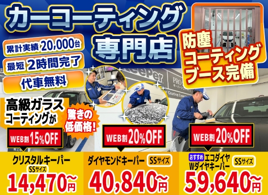 | 担当者のコメント | この度はダイヤモンドキーパー施工ありがとうございました。 ノーメンテナンスで3年、年に一回のメンテナンスで5年間愛車のボディーをしっかりお守り致します。 その他、いつでもお気軽にご相談下さい!! スタッフ一同またのご来店を心よりお待ちしております! |