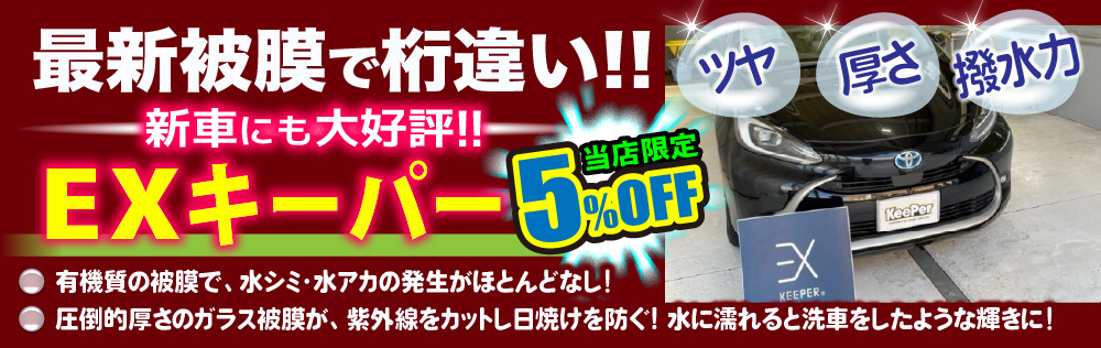 | 特徴 | ガラス被膜と、汚れの密着を防ぐ独特な防塵能力を持つECOプラスレジン被膜の二重構造。 EXキーパー同様に、雨での汚れの落ち方(自浄効果)がとても強く、ほとんど洗車をしないでもキレイなまま乗れます。 ※雨自体が黄砂等を含んで汚れている場合は、洗車をして頂ければ、キレイになります。 水シミ、紫外線の防止にもなり、クルマの価値を守ります。 一年に一度繰り返すことで塗装が守られるだけでなく、更に良いツヤが出て美しくなります。 |