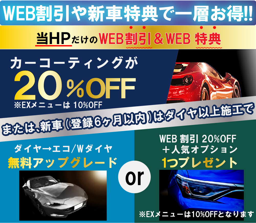 特徴 | 高密度ガラス被膜と、汚れの密着を防ぐ独特な防塵能力を持つECOプラスレジン被膜の二重構造。 EX同様に、雨での汚れの落ち方(自浄効果)がとても強く、ほとんど洗車をしないでもキレイなまま乗れます。 ※雨自体が黄砂等を含んで汚れている場合は洗車をして頂ければ、キレイになります。 |