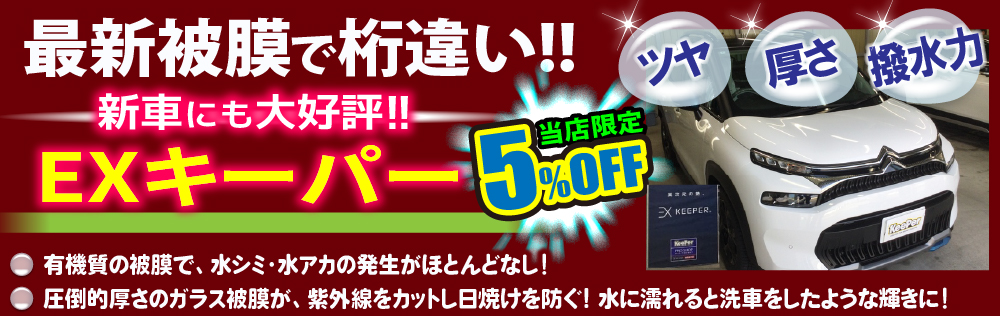 | 特徴 | ガラス被膜と、汚れの密着を防ぐ独特な防塵能力を持つECOプラスレジン被膜の二重構造。 EXキーパー同様に、雨での汚れの落ち方(自浄効果)がとても強く、ほとんど洗車をしないでもキレイなまま乗れます。 ※雨自体が黄砂等を含んで汚れている場合は、洗車をして頂ければ、キレイになります。 水シミ、紫外線の防止にもなり、クルマの価値を守ります。 一年に一度繰り返すことで塗装が守られるだけでなく、更に良いツヤが出て美しくなります。 |