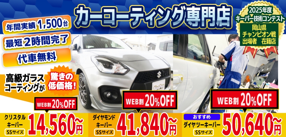 | 担当者のコメント | Wダイヤモンドキーパー施工ありがとうございました! 小傷、経年劣化による塗装の状態等がお悩みでしたが、Wダイヤモンドキーパー施工により お客様のお悩みをすべて解決し、『新車以上』の艶、輝きが出ましたね! 愛車のお悩みなら是非当店へ! またのご来店心よりお待ちしております! |