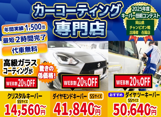 | 担当者のコメント | エコダイヤキーパープレミアム施工ありがとうございました。 エコダイヤキーパープレミアムは自洗効果があり、雨が洗車に!! 日頃のお手入れもお任せください。 |