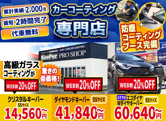 当HP掲載の電話番号、またはご予約フォームからご予約・お見積頂いたお客様に限り、コーティング料金(クリスタルキーパー・ダイヤモンドキーパー・ダブルダイヤキーパー・エコダイヤキーパー)から上記割引させて頂きます!